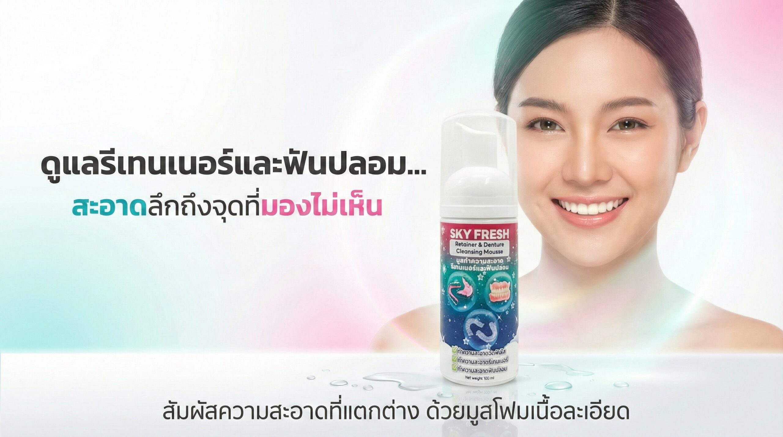 Sky Fresh Retainer & Denture Cleansing Mousse เป็นผลิตภัณฑ์แบบ มูสโฟม สำหรับทำความสะอาด “ชิ้นงานถอดได้” เช่น รีเทนเนอร์ ฟันปลอม และเฝือกสบฟัน เพื่อช่วยลด คราบสะสมและกลิ่นอับ เมื่อดูแลอย่างสม่ำเสมอ