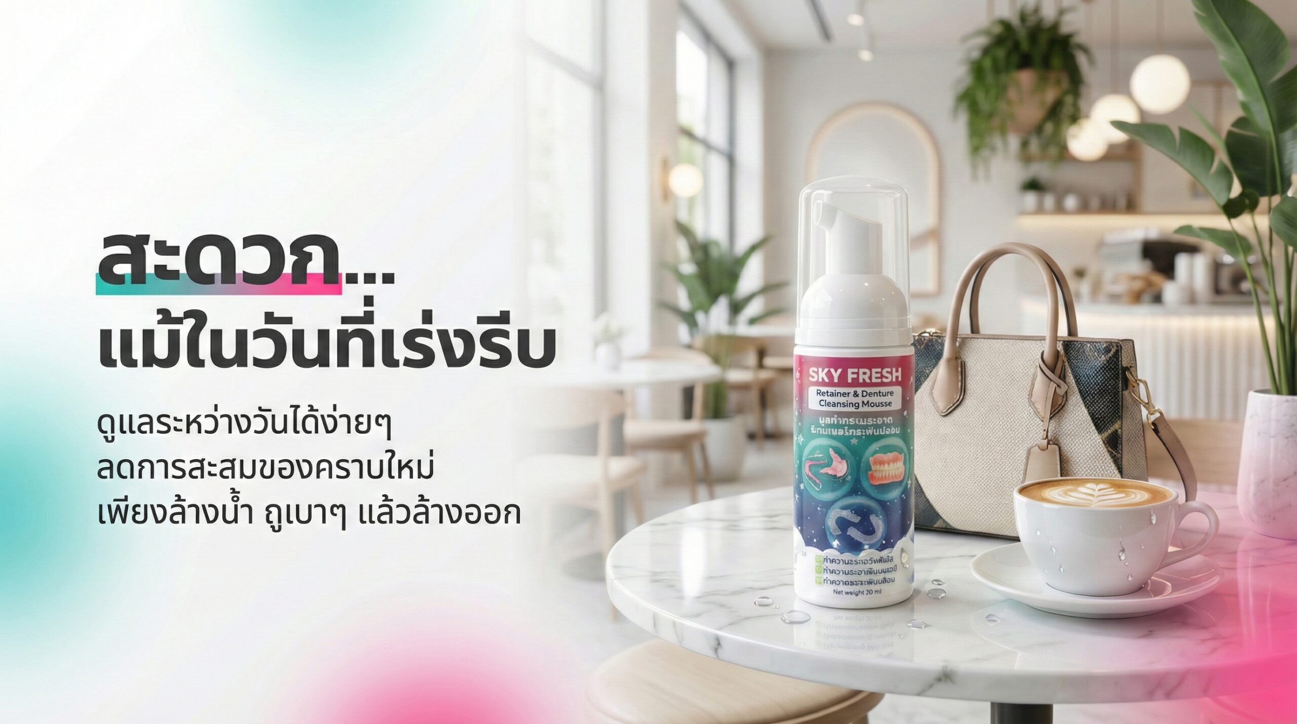Sky Fresh Retainer & Denture Cleansing มูสโฟม คือผลิตภัณฑ์ทำความสะอาดที่ออกแบบมาสำหรับ “ชิ้นงานถอดได้” โดยเฉพาะ เช่น รีเทนเนอร์ ฟันปลอม และเฝือกสบฟัน (Night Guard) ซึ่งเป็นอุปกรณ์ที่ต้องสัมผัสกับน้ำลายและความชื้นอยู่เป็นประจำ จึงมีโอกาสสะสมคราบตามขอบและซอกมุมได้ง่าย รวมถึงเกิดความหมองหรือกลิ่นอับจากความชื้นที่ค้างอยู่ โดยเฉพาะในวันที่เร่งรีบที่หลายคนทำได้เพียงล้างน้ำผ่าน ๆ แล้วใส่กลับหรือเก็บเข้ากล่อง ทำให้คราบและความชื้นสะสมต่อเนื่องโดยไม่รู้ตัว